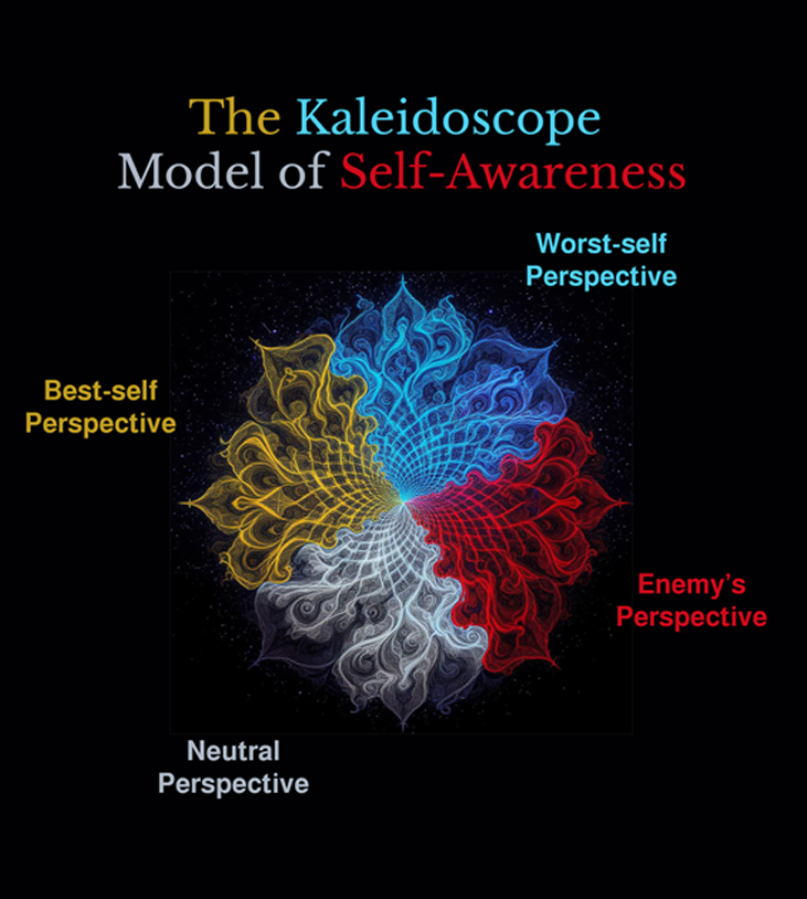The Kaleidoscope Model of Self-Awareness is a vibrant, insightful tool designed to help individuals explore and deepen their understanding of themselves. Inspired by the ever-shifting patterns of a kaleidoscope—a device that creates intricate, colorful designs by reflecting light through mirrors and objects—this model uses a four-lens framework. These lenses are represented as overlapping sections in a fractal-inspired, Mandelbrot-like mosaic: Best-self Perspective, Worst-self Perspective, Neutral Perspective, and Enemy’s Perspective. At the center, where these perspectives converge, lies the Clarity Zone, a dynamic space where a holistic view of the self emerges.Understanding the Model